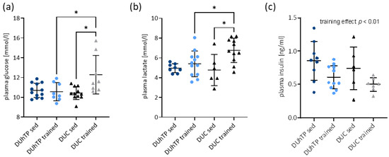 Analysis of metabolites in the circulation. (a) Blood glucose (n ≥ 8), (b) plasma lactate (n ≥ 6), and (c) plasma insulin (n ≥ 6) in trained and sedentary DUhTP (light/dark blue) and DUC mice (gray/black). All results are presented as scatter plots with mean and standard deviations. Statistical analysis was performed using two-way ANOVA. The training-mediated effect on plasma insulin level was statistically evaluated by using an unpaired t-test with Welch correction. Significant differences as indicated: * p < 0.05.