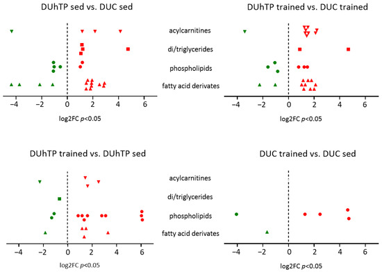 Significantly upregulated (red-colored) and downregulated (green-colored) levels of various acylcarnitines (triangles, tip down), di-/triglycerides (squares), phospholipids (circles), and fatty acid derivates (triangles, tip up) in the serum samples of sedentary or trained DUhTP mice (n = 10) and controls (n = 10) analyzed by untargeted metabolomics using high-resolution LC-MS/MS. Significant (p < 0.05) increases or decreases are labeled in red or green. Differences are shown as log2FC.