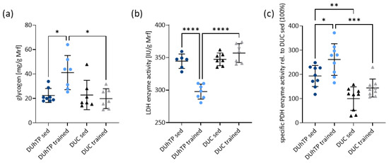 Analysis of metabolites and metabolic enzymes in muscle tissue of trained and sedentary DUhTP (light/dark blue) and DUC mice (gray/black). (a) Muscle glycogen content and (b) the lactate dehydrogenase (LDH) enzyme activity were determined per gram of Musculus rectus femoris (Mrf, n ≥ 6 per group). (c) Pyruvate dehydrogenase activity was measured over a duration of 30 min (Mrf, n = 9) and displayed as changes relative to DUC sed. All results are presented as scatter plots with mean and standard deviations. Statistical analysis was performed using two-way ANOVA. Significant differences as indicated: * p < 0.05, ** p < 0.01, *** p < 0.001, **** p < 0.0001.