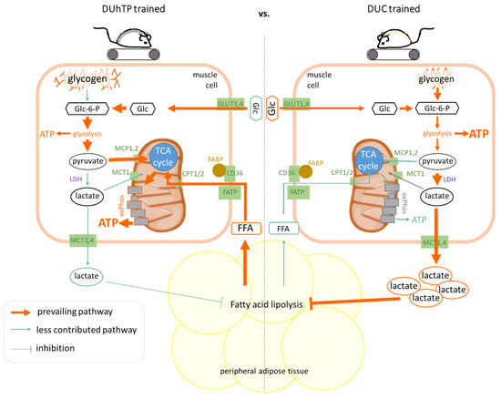 Despite the adaptation of running time and speed in the training design of this study to the capabilities of the mice, anaerobic glucose utilization plays a more important role in energy supply in the control line than in our marathon mouse model in response to physical activity, as evidenced by higher muscular CK activity, higher LDH activity and elevated plasma lactate levels in DUC than DUhTP mice. High circulating plasma lactate levels suppress the need for lipolysis because glucose and glycogen are abundant [8]. In this context, plasma lactate acts directly as a signal to adipose tissue by binding to the highly expressed receptor GPR81 in adipose tissue and leading to a dose-dependent inhibition of glycerol and FFA release via inhibition of adenylyl cyclase [59,60]. In contrast, GPR81-deficient mice do not show an antilipolytic response to lactate [60]. In marathon mice, the anti-lipolytic signal is absent during exercise due to low plasma lactate levels resulting from reduced LDH activity (Figure 5). Instead, increased fat mobilization from peripheral adipose tissues occurs alongside glucose oxidation without glycogen breakdown contribution, resulting in decreased fat depots (epididymal and posterior subcutaneous).