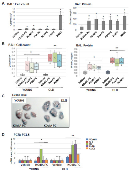 Next, we tested five Tr-OxPL species: KOdiA-PC, PONPC, Paz-PC, POVPC, and PGPC, for their capability to induce ALI in mice. The results showed that all five Tr-OxPLs caused the modest elevation of BAL cell counts compared to robust leukocyte recruitment to the lung caused by HKSA, suggesting the low proinflammatory potential of Tr-OxPLs per se. In contrast, Tr-OxPLs caused a pronounced increase in BAL protein content that was comparable with the effect of HKSA. These results suggest that increased lung vascular permeability is an early effect of acute Tr-OxPL elevation (Figure 2A). Comparative analysis showed that old mice exhibited higher BAL total cell counts and protein concentration upon challenge with KOdiA-PC or Paz-PC (Figure 2B). Likewise, old mice showed higher level of Evans blue accumulation in the lung parenchyma than in the young group, indicating enhanced vascular permeability in the old group (Figure 2C). PCLS isolated from lungs of young and old mice also showed that KOdiA-PC-induced increase in mRNA transcripts of VCAM-1, IL-6, IL-1B, and CCL2 was much higher in the old group (Figure 2D).