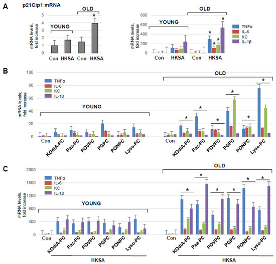 The incubation of mLEC with KOdiA-PC, PONPC, Paz-PC, POVPC, Lyso-PC, or PGPC also induced the transcriptional activation of TNFα, IL-6, KC, and IL-1β, although to a much lesser extent than HKSA (Figure 4B). Importantly, the magnitude of inflammatory response was significantly higher in mLEC from the old group. The two-hit model of mLEC challenged with Tr-OxPLs and HKSA (Figure 4C) showed augmented mRNA expression of all inflammatory markers upon combined HKSA and Tr-OxPL treatment as compared to challenge with either agonist alone (Figure 4A,B). Moreover, the magnitude of such response to HKSA and Tr-OxPL combination was further exacerbated by mLEC isolated from old mice (Figure 4C).
