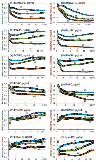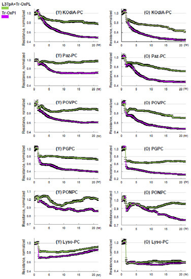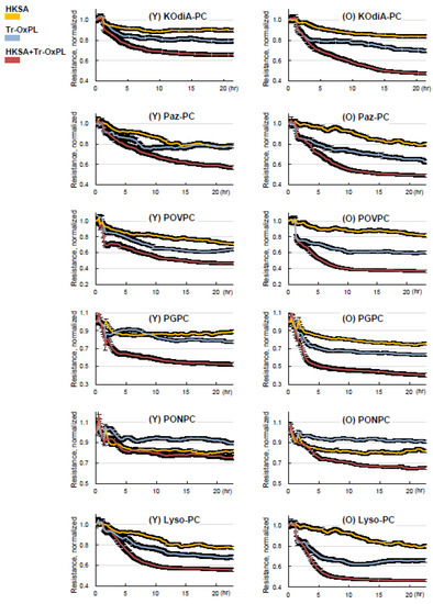 We investigated whether the phenomenon of age-dependent exacerbation of inflammation and lung barrier dysfunction observed in animal models can also be detected in lung EC cultures isolated from young and old mice. Primary cultures of ECs from young and old lungs were exposed to increasing concentrations of KOdiA-PC, PONPC, Paz-PC, POVPC, Lyso-PC, and PGPC. A dose-dependent decline in TER reflecting increased permeability was observed in both young and old lung ECs. However, Tr-OxPLs-induced permeability response was more pronounced in lung ECs from the old group as compared to young EC counterparts (Figure 5). Of note, all tested Tr-OxPLs concentrations had no significant effects on cell viability, even at later time points up to 24 h. These observations are in agreement with our previous studies showing no changes in live/dead ratio in the cells treated with a high dose (100 µg/mL) of oxidized phospholipids mixture [32].