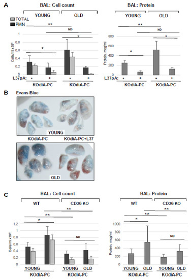 Inhibition of CD36 ameliorates Tr-OxPLs-induced lung injury in vivo. (A) Young and old mice received concurrent injection of L37pA (20 mg/kg, i.v.) and KOdiA-PC (10 mg/kg, i.v.). After 24 h, BAL was collected to determine total protein content, total cell counts and PMN counts; n = 6, * p < 0.05 vs. KOdiA-PC alone, ** p < 0.05 vs. young group. (B) Evans blue lung extravasation assay in KOdiA-PC-challenged mice. Shown are representative images of three independent experiments; n = 6 mice per condition. (C) Young and old CD36 knockout mice were exposed to KOdiA-PC; protein content, total cell and PMN counts were determined in BAL; n = 6, * p < 0.05 vs. young group; ** p < 0.05 vs. wild-type group; ND, no difference.