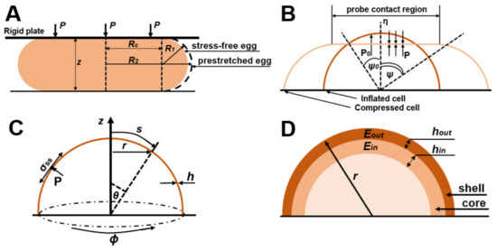 In another publication, Feng and Yang described the compression of a spherical membrane filled with liquid (Equations (4)–(7), Figure 1B) [36]. The cell wall in this model is divided into areas in contact with and not in contact with the compressive regions. There are separate groups of defining equations for the contact and non-contact regions: