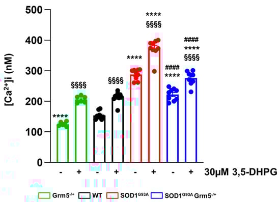 Abnormal intracellular calcium signaling is a key player sustaining astrocyte-mediated neurotoxicity in ALS [,]. mGluR5 activation can trigger intracellular pathways inducing [Ca2+]i oscillations resulting in pathological conditions. Therefore, we investigated the effect of partial mGluR5 genetic deletion on [Ca2+]i in our experimental conditions. The [Ca2+]i was measured in WT, Grm5−/+, SOD1G93A, and SOD1G93AGrm5−/+ spinal cord astrocytes using the fluorescent dye FURA-2/AM under basal condition and after a stimulus with 30 µM 3,5-DHPG. The [Ca2+]i was dramatically increased in SOD1G93A compared to WT astrocytes under basal conditions. The elevated basal [Ca2+]i in SOD1G93A astrocytes was significantly reduced in spinal cord astrocytes cultured from double mutant SOD1G93AGrm5−/+ mice, although [Ca2+]i did not return to the WT astrocyte level (Figure 2). Exposure of primary astrocyte cultures to the selective group I mGluR agonist 3,5-DHPG (30 µM) significantly increased [Ca2+]i over the basal level in all astrocyte genotypes. Of note, the 3,5-DHPG-stimulated [Ca2+]i was significantly reduced in SOD1G93AGrm5−/+ astrocytes compared to SOD1G93A astrocytes (Figure 2).