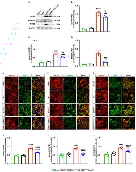 WB showed a significantly higher expression of all the markers in SOD1G93A compared to WT astrocytes (Figure 3A–D). In Grm5−/+ astrocytes, the levels of GFAP, vimentin and S100β expression were comparable to those in WT astrocytes (Figure 3A–D), while the partial mGluR5 deletion significantly reduced the overexpression of GFAP, vimentin and S100β.