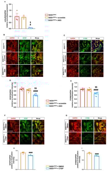 Spinal cord astrocytes from late symptomatic SOD1G93A mice were exposed to the anti-mGluR5 ASO (20 µM) or control ASO for 48 h, and the astrocyte mGluR5 expression and the modulation of reactive astrogliosis were investigated. Quantitative RT-qPCR demonstrated that exposure of SOD1G93A astrocytes to the ASO abolished the mGluR5-encoding mRNA expression compared to untreated or scramble-treated SOD1G93A astrocytes (Figure 4A). IF confocal microscopy experiments indicated a reduced mGlur5 protein translation in SOD1G93A astrocytes when exposed to the anti-mGluR5 ASO (Supplementary Figure S5).