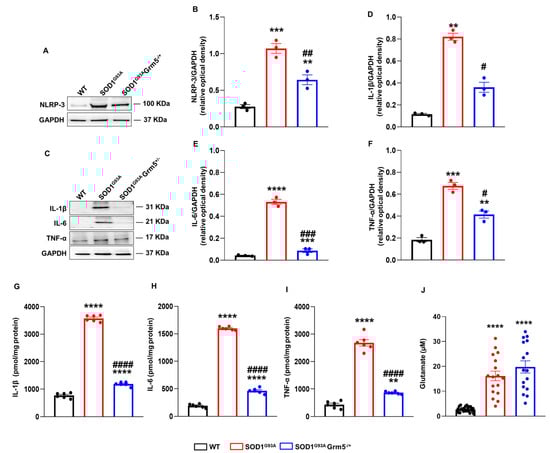 NLRP-3 inflammasome complex expression, cytokines and glutamate release in the culture medium of spinal cord astrocytes cultured from adult WT, SOD1G93A and SOD1G93AGrm5−/+ mice. (A–C) Representative Western blot (WB) immunoreactive NLRP-3 (A) and IL-1β, IL-6, and TNF-α (C) bands. (B,D–F) Quantitative representation of WB densitometric signals of (B) NLRP-3, (D) IL-1β, (E) IL-6, and (F) TNF-α. Protein band density was normalized to GAPDH as a housekeeping protein. Data are means ± s.e.m of n = 3 independent experiments. ** p < 0.01, *** p < 0.001 and **** p < 0.0001 vs. WT astrocytes; # p < 0.05, ## p < 0.01 and ### p < 0.001 vs. SOD1G93A astrocytes (F(3,8) = 55.83, F(2,6) = 23.18, F(2,6) = 106.2 and F(2,6) = 38.49 for NLRP-3, IL-1β, IL-6 and TNF-α respectively; one-way ANOVA followed by Tukey’s multi-comparison test). (G–I) Enzyme-linked immunosorbent (ELISA) assay of the (G) IL-1β, (H) IL-6, and (I) TNF-α released in the astrocyte culture medium. Cell culture medium was collected after 24 h, and the inflammatory cytokine content was measured with specific ELISA kits and expressed as pmol per mg of astrocyte’s total protein content in each well. Data means ± s.e.m of n = 6 independent experiments. ** p < 0.01 and **** p < 0.0001 vs. WT astrocytes; #### p < 0.0001 vs. SOD1G93A astrocytes (F(2,15) = 1563, F(2,15) = 2426 and F(2,15)= 251.4, for IL-1β, IL-6 and TNF-α, respectively; one-way ANOVA followed by Tukey’s multi-comparison test). (J) Glu release in the astrocyte culture medium. Cell culture medium was replaced with Hepes-buffered physiological medium, which was collected after 4 h. Glu content was measured by HPLC after orthophthaldialdehyde derivatization and fluorometric detection. The physiological medium without cells contained 0.01 ± 0.002 µM of Glu (not shown). Glu is expressed as micromolar (µM) concentrations in each well, containing an average of 1 × 105 cells. Data are means ± s.e.m of n = 16–27 wells (independent biological replicates). **** p < 0.0001 vs. WT astrocytes (F(2,57) = 40.70; one-way ANOVA followed by Tukey’s multi-comparison test).