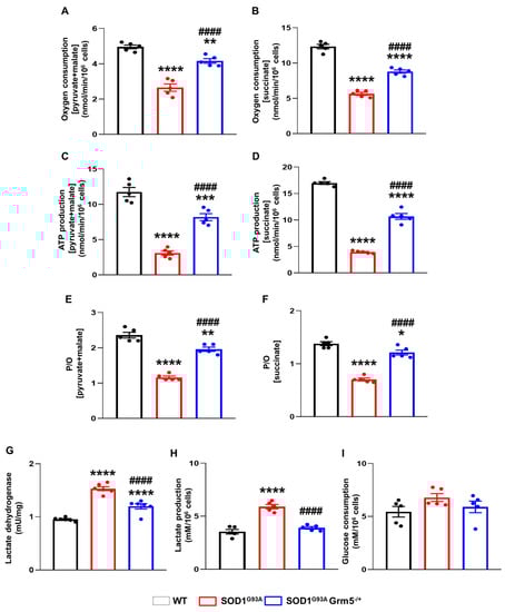 The enhanced anaerobic glycolytic flux, representing the prominent metabolism in astrocytes for ATP production [,] may compensate for reduced OxPhos-driven ATP synthesis, although less efficiently than aerobic metabolism. Data show that the activity of LDH, a key glycolytic enzyme (Figure 6G), and lactate production (Figure 6H) were augmented in SOD1G93A astrocytes with respect to WT cells, indicating a partial compensatory effect in response to the OxPhos impairment. SOD1G93AGrm5−/+ astrocytes also displayed higher LDH activity (Figure 6G) than WT astrocytes, although their LDH activity was lower than that of SOD1G93A astrocytes. Conversely, lactate production was normalized in SOD1G93AGrm5−/+ astrocytes (Figure 6H). In addition, glucose consumption was comparable in WT, SOD1G93A, and SOD1G93AGrm5−/+ astrocytes (Figure 6I).