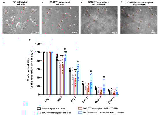 Motor neurons (MNs) were prepared from the spinal cord of WT and SOD1G93A E13.5 mouse embryos as previously described with minor modifications [,,]. Briefly, spinal cords were dissected under microscopy (Carl Zeiss 475110-9902 Microscope, Milan, Italy). Meninges and dorsal root ganglia were removed. The ventral spinal cord was cut into small pieces and digested in 0.5% trypsin (Merck, Milan, Italy, Cat# T4799) in Hank’s Balance Salt Solution (HBSS, Euroclone, S.p.A, Milan, Italy, Cat# ECM0507L) for 20 min at 37 °C. The trypsin solution was replaced with a mix of 0.02 mg/mL deoxyribonuclease I (DNAse; Merck, Milan, Italy, Cat#DN25) and 0.4% BSA (Sigma-Aldrich, Cat# A3311) in Leibovitz-15 medium (Merck, Milan, Italy, Cat# L5520) and gently triturated. The tissue homogenate was stratified on a 6.2% OptiPrep (Merck, Milan, Italy, Cat# D1556) cushion and centrifuged at 500× g for 15 min at RT. The MN-enriched cell population was resuspended in an MN complete medium, composed of neurobasal medium (Thermo Fisher Scientific, Monza, Italy, Cat# 21103-049), 2% B27 supplement (ThermoFisher Scientific, Monza, Italy, Cat# 17504044), 2% horse serum (Thermo Fisher Scientific, Monza, Italy, Cat# 16050130), 0.5 mM stable L-Glutamine (Thermo Fisher Scientific, Monza, Italy, Cat#35050038), 25 µM Mercapto ethanol (Merck, Milan, Italy, Cat# M6250), 10 ng/mL ciliary neurotrophic factor (CNTF; Merck, Milan, Italy, Cat# C3835), 100 pg/mL glial-derived neurotrophic factor (GDNF; Merck, Milan, Italy, Cat# G1401) and 5 µg/mL Penicillin/Streptomycin. MN suspensions were layered on the top of a 4% BSA gradient containing 20 µL of 1 mg/mL DNAse and centrifuged at 75× g for 20 min to remove Optiprep impurity. Then, the pellet was suspended in 1 mL of MN medium containing 50 µL of Chick Embryo Extract (US Biological, MA, US, Cat# C3999). Then, 5 × 104 MNs were seeded in a 35 mm Petri dish on a confluent layer of spinal cord astrocytes prepared from 120-day-old WT, SOD1G93A or SOD1G93AGrm5−/+ mice. MN purity was assessed as previously described [] (Supplementary Figure S2). During culturing, the medium was replaced with fresh MN complete medium every 48 h. MN viability was assessed as previously described []. MNs were counted in an area equal to 1 cm2 (using a 10 mm × 10 mm grid pre-designed at the bottom of the Petri dish). Starting from day 4 after seeding, the number of viable MNs in the predesigned 1 cm2 grid was recorded three times a week for 14 days. The number of surviving MNs at each time point was calculated as % of the total number of MNs, counted in the same 1 cm2 square area of the respective dish, at day 4 of co-culture, as the starting day of cell counting (reported as 100% of total MNs).
