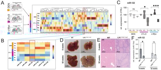 miR-122 is downregulated in inflammatory hepatocellular carcinoma. miR−122 is significantly downregulated in the tumor tissue isolated from the livers of lymphotoxin (LT, Purple) c-Myc (blue) over-expressing animals but not in the tissue isolated from (DEN, orange) animals. (A) Heat map depicting unsupervised hierarchical clustering of HCC models with respect to controls. The color scale illustrates the fold change of miRNAs across the samples. (B) Visualization of miRNAs downregulated in the tumor tissue of LT and c-myc models but not in the DEN model. (C) miR−122 expression as box plots (n = 5). (D) Representative image on the livers of wild type (ET) and LPCΔTraf2, Casp8 mice at 6 and 52 weeks. (E) Representative HE staining of the liver of control (WT) and LPCΔTraf2, Casp8 mice at 6 and 52 weeks of age. (F) Expression of miR−122 in the liver of WT and LPCΔTraf2, Casp8 mice at 6 and 52 weeks (normalized to miR-15a, n = 4). Results are represented as mean ± SD, significant differences were evaluated by using the one-way ANOVA or the t-test as appropriate (ns = Not significant; *, p ≤ 0.05; and ***, p ≤ 0.0001).