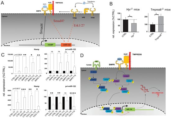 To investigate miR-122′s role in non-resolving acute inflammation, we analyzed the mechanisms behind its downregulation. We have previously shown that miR-122 was downregulated in the livers of Hfe-deficient mice [15] suggesting that signaling pathways downstream to Hfe are required to maintain transcription of miR-122 gene. Two signaling pathways are known to act downstream to Hfe: (i) the extracellular signal-regulated kinase 1 and 2 (Erk1/2), where the binding of holotransferrin to TfR2 in a complex with Hfe induces Erk1/2 phosphorylation [34], and (ii) the Hjv/BMP6R (bone morphogenetic protein-6 receptor) complex which activates Smad signaling by forming the Smad1/5/8–Smad4 complex [35] (Figure 2A). Our study revealed a significant downregulation of miR-122 in the livers of Hjv−/− animals (Figure 2B). Importantly, Hjv, like Hfe, is crucial for Hamp transcription maintenance [36] and the liver of Hjv−/− mice exhibits iron overload [37]. Additionally, we measured miR-122 expression in the livers of transmembrane serine protease 6 (Tmprss6)−/− mice. Tmprss6, a member of the type II transmembrane serine protease family, controls hepcidin transcription and inhibits this pathway by mediating Hjv proteolysis [38]. Notably, mutations preventing Tmprss6 activity lead to a rare inherited form of iron deficiency anemia called Iron-Refractory Iron Deficiency Anemia (IRIDA; [39,40]). Interestingly, our results identified a significant upregulation of miR-122 in the livers of Tmprss6−/− transgenic mice (Figure 2B). These results support the conclusion that the iron sensing complex regulates miR-122 transcription downstream of Hjv/BMP6R signaling.