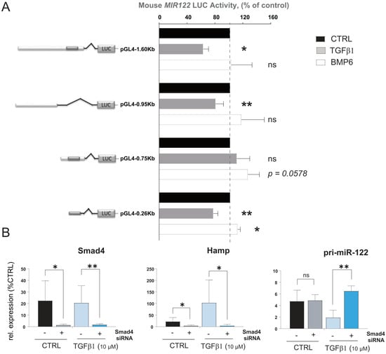 Mouse miR−122 promoter regions respond to BMP6 and TGFβ stimulation. (A) Different lengths of upstream sequences of the mouse miR−122 promoter region were isolated and cloned in the luciferase reporter vector. Hepa1−6 cells were transfected with constructs and treated with BMP6 or TGFβ1, or left untreated (n = 5). Cell were lysed 48 h after the transfection and Luciferase activity was measured. Data represent average luciferase activity in % of control (n = 5). (B) Mouse primary hepatocytes were transfected with anti−Smad4 siRNA or scramble oligos (CTRL). Levels of pri−miR−122 were measured 18 h after TGFβ1 administration (n = 4). Results are represented as mean ± SD, significant differences were evaluated by using the one-way ANOVA or the t-test as appropriate (ns = Not significant; *, p ≤ 0.05; and **, p ≤ 0.01).