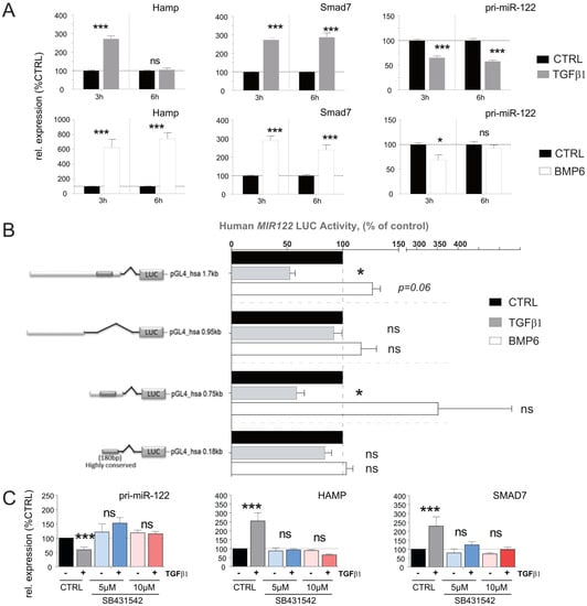 3.3. miR-122 Transcription Is Differentially Regulated by TGFβ1 and BMP6
