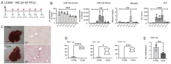 To investigate the potential role of inflammation in the downregulation of miR-122 in liver diseases, we conducted a study using mice infected with lymphocytic choriomeningitis virus (LCMV). LCMV belongs to the Arenaviridae family and is a non-lytic, single-stranded RNA virus. In our study, we focused on the LCMV WE strain, which induces acute hepatitis in mice that is subsequently cleared from the liver by CD8+ T cells within approximately two weeks [52,53]. To assess whether miR-122 expression is affected by viral infection in vivo, we infected wild-type mice (C57BL/6J) with LCMV WE (2 × 106 PFUs), following analysis at different time points of infection (Figure 5A). As indicators of hepatocellular necrosis, we measured the levels of alanine aminotransferase (ALT) and bilirubin (Figure 5B). Interestingly, we observed a reduction in miR-122 expression in the liver of infected animals starting from day 6 post-infection (Figure 5B). Interestingly, increased levels of circulating cell-free miR-122 were simultaneously observed in the sera of these mice. Furthermore, we explored the effects of carbon tetrachloride (CCl4) administration, which is known to induce inflammatory and fibrotic signals, on miR-122 expression. Furthermore, we found that CCl4 treatment (Figure 5C,D) resulted in a significant downregulation of miR-122 (Figure 5E), even in the absence of hepatic cirrhosis or cancer. Collectively, these results support the conclusion that the downregulation of miR-122 observed in acute liver inflammation (e.g., LCMV WE infection) and chronic liver disease (e.g., CCl4 administration) is potentially a physiological response mediated by pro-inflammatory stimuli. These data also suggest the existence of a previously uncharacterized regulatory network linking infection and inflammation to declined miR-122 expression.