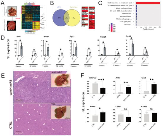 Analysis of gene expression in the livers of LT and c-myc mice. (A) Unsupervised hierarchical clustering of the genes regulated in the livers of LT α/β and c-Myc overexpressing mice. The color scale illustrates the fold change of mRNAs across the samples (Generated by Altanalyze). (B) Overlap between significantly downregulated genes and miRWalk predicted miR−122 targets. (C) ShinyGO enrichment analysis of potential miR−122 targets. (D) qPCR analysis of the expression of highly enriched genes in the liver of LPCΔTraf2, Casp8 animals at 6 and 52 weeks (n = 4). (E) Representative livers and HE staining of camiN-mirE and matching control (CTRL) untreated mice. (F) qPCR analysis of miR−122, Anln, Hmmr, Tpx2, Ccnb1, and Ccnb2, in the RNAs extracted from the livers of camiN-mirE (n = 7) and CTRL (n = 4) mice. Results are represented as mean ± SD, significant differences were evaluated by using the t-test (ns = Not significant; *, p ≤ 0.05; **, p ≤ 0.01; and ***, p ≤ 0.001).