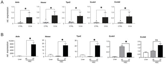 Analysis of gene expression in the livers of CCl4-injected mice and in activated HSCs. (A) qPCR expression of Anln, Hmmr, Tpx2, Ccnb1, and Ccnb2, in the livers of CCl4-treated (n = 5) and oil-injected control (CTRL) mice (n = 5). (B) Relative expression of GOIs in naïve and activated mouse HSCs and in the RNA extracted from the livers of WT animals (n = 3). Results are represented as mean ± SD, significant differences were evaluated by the using t-test (ns = Not significant; *, p ≤ 0.05).