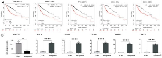 The downregulation of miR-122 in chronic liver diseases was further supported by the analysis of available databases, including GEO (e.g., accession number GSE51429, Supplementary Figure S7) and The Cancer Genome Atlas (TCGA; Supplementary Figure S8). To this end, detailed analysis of the expression data from the TCGA cohort of patients with hepatocellular carcinoma (LIHC) shows that miR-122 was significantly downregulated already at the early stages of HCC, while the Kaplan–Meier curve shows that patients with higher miR-122 expression have a significantly higher probability of survival than patients with lower miR-122 expression (p = 0.014; Supplementary Figure S8). Notably, and in agreement with what was observed in the mouse models of liver cancer, ANLN, HMMR, TPX2, CCNB1, and CCNB2 expressions were found to be significantly upregulated in TCGA-LIHC (Supplementary Figure S9A). Furthermore, the Kaplan–Meier curves for ANLN, HMMR, TPX2, CCNB1, and CCNB2 showed that a high expression of these genes was associated with an unfavorable prognosis (Figure 8A and Supplementary Figure S9B), which corroborated the analysis of ANLN, HMMR, TPX2, CCNB1, and CCNB2 in publicly available dataset from GEO (e.g., GSE62232, Supplementary Figure S7 and GSE6764, Supplementary Figure S10). To investigate the potential (direct or indirect) regulation of ANLN, HMMR, TPX2, CCNB1, and CCNB2 expression by miR-122, human hepatoma cells Huh-7 were transfected with an antagomiR targeting miR-122 [15], and the expression of these genes was evaluated by qPCR. Our findings demonstrate that RNA levels of ANLN, HMMR, TPX2, CCNB1, and CCNB2 significantly increased in response to antagomir-mediated inhibition of miR-122 (Figure 8B). This supports the conclusion that miR-122 plays a role in controlling the expression of the aforementioned genes in Huh-7 cells, either directly or indirectly.