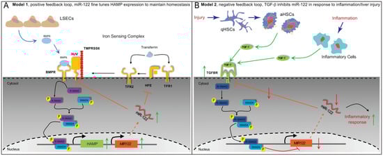 Based on the findings presented in this study, we propose that the expression of miR-122 in the liver is governed by at least two locally competing regulatory loops. Firstly, a positive feedback loop (Figure 9A, model 1) is established, wherein liver sinusoidal endothelial cells (LSEC) secrete BMP6 [56] to co-regulate Hamp and miR-122 expressions in response to changes in body iron requirements. Secondly, a negative feedback loop (Figure 9B, model 2) is activated in response to local injury or inflammation, whereby TGFβ1 secreted by activated HSCs or immune cells suppresses miR-122 transcription to trigger inflammatory responses. This hypothesis gains support from the notable observation that TGFβ1 administration significantly reduces Hjv expression in mouse hepatocytes (Supplementary Figure S2B). This may serve as an alternative mechanism to ensure the deactivation of iron-mediated modulation of miR-122. Notably, Yin et al. have previously demonstrated that miR-122 targets the TGFβ1 signaling pathway in both humans and mice [57]; this, along with the outcomes obtained in our study, leads us to suggest that TGFβ1 and miR-122 mutually regulate each other through a negative feedback loop. Notably, dysregulation of this regulatory loop may play a pivotal role in the development and progression of hepatocellular carcinoma. Literature mining has further revealed an inverse correlation between miR-122 and TGFβ1 levels in patients with liver diseases, including non-alcoholic fatty liver disease [58], primary biliary cholangitis [59], HCC [60], and viral hepatitis [61].