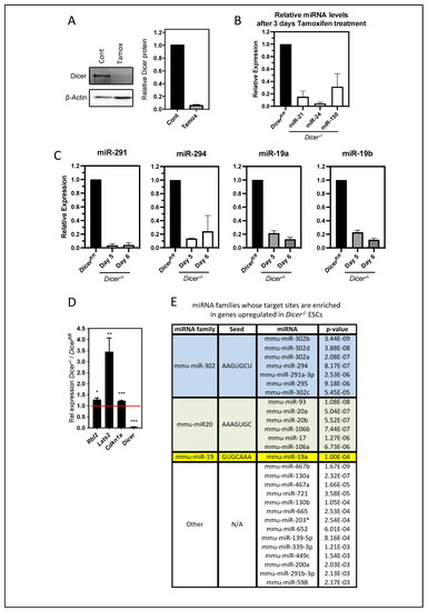 To examine the roles of miRNAs in ESCs, we utilized a system previously optimized by us to study miRNA function in stem cell lines in which the deletion of Dicer could be induced to prevent miRNA synthesis [24]. This system was advantageous in that it allowed for the examination of the immediate effects of the loss of miRNAs and avoided any complications from secondary changes that could occur during the isolation of stable cell lines lacking Dicer. The deletion of Dicer was accomplished using ESCs containing floxed alleles of Dicer and a Cre-ERT2 fusion gene knocked into the ubiquitously expressed Rosa26 locus [20]. The constitutively expressed Cre-ERT could be activated in these cells to delete Dicer by the addition of tamoxifen. Optimal conditions for the deletion of Dicer mRNA and protein and the loss of miRNAs were established in ESCs by treatment with varying concentrations of tamoxifen. After three days of treatment, 0.5 mM tamoxifen produced an approximately 20-fold loss of Dicer mRNA and protein and a significant reduction in selected miRNAs that are highly expressed in ESCs and the pre-implantation embryo [24] (Figure 1A,B). Tamoxifen was then removed to avoid any possible toxicity complications and the cells were cultured for two or three additional days. At these times, several miRNAs of the miR-290/302 family, which is the most abundantly expressed miRNA family in ESCs, remained significantly depleted, as well as miR-19a and 19b, which are also abundantly expressed in ESCs and the early embryo [24,25] (Figure 1C). Therefore, any cells that had escaped Dicer deletion that could have a selective growth advantage [6] did not overgrow the population during the timeframe of our analysis.