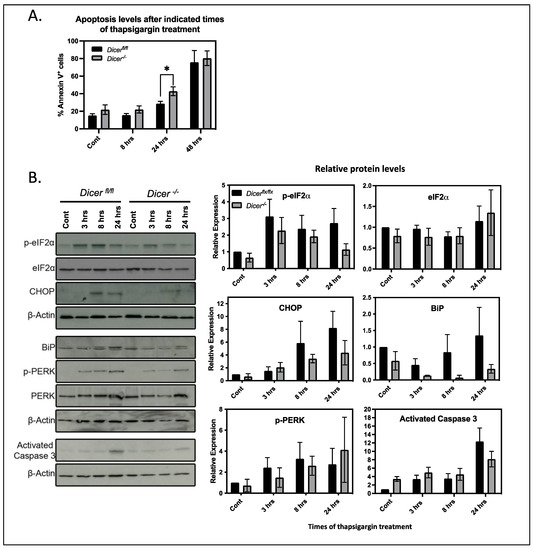 Dicer−/− ESCs have virtually no difference in stress response pathways. (A) Dicerfl/fl and Dicer−/− ESCs were treated for the indicated times with 200 nM thapsigargin. Apoptotic cells were determined by Annexin V staining directly after the indicated time of treatment. Dicer−/− ESCs had a slight but significant increase in apoptotic cells after 24 h of thapsigargin treatment (p = 0.034) but showed no difference at 8 or 48 h of treatment. Data are from three independent experiments. (B) A total of 200 nM thapsigargin treatment for the indicated times did not induce an increase in the activation of the canonical stress pathways in Dicer−/− ESCs as measured by the expression or phosphorylation levels of indicated proteins in Western blots. Representative Western blots of three independent experiments are presented, and the densitometric quantitation from repeat experiments normalized to b actin is shown on the right, * p < 0.05.