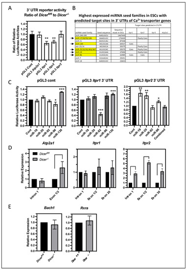 To determine if miRNA regulation of Itpr2 and Atp2a1 involves a direct targeting of miRNAs to sequences in their 3′UTRs, luciferase reporters were constructed containing their 3′ UTRs and tested for miRNA regulation in ESCs. In addition, 3′ UTR reporters were also constructed for Itpr1 and Itpr3. These were transfected into Dicerfl/fl and Dicer−/− ESCs along with a Renilla luciferase gene to normalize transfection efficiency. Comparing the ratio of the relative luciferase activities between Dicerfl/fl and Dicer−/− ESCs revealed that the 3′ UTRs of Itpr2 and Itpr1 imparted miRNA regulation on luciferase expression, whereas the 3′ UTRs of Itpr3 and Atp2a1 did not (Figure 6A). The lack of effect of the Atp2a1 3′ UTR contrasted with the effect of miRNAs on the endogenous gene. Therefore, other mechanisms must indirectly mediate miRNA regulation of the endogenous gene. Also in discordance was the miRNA regulation imparted by the Itpr1 3′ UTR as the endogenous gene appeared not to be regulated by miRNAs. Therefore, the effect of its 3′ UTR appeared to be context-dependent. Nevertheless, its regulation along with that of Itpr2 was pursued to identify individual regulatory miRNAs.