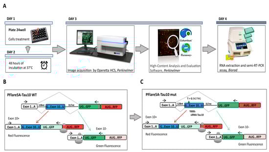 The following supporting information can be downloaded at https://www.mdpi.com/article/10.3390/cells12151959/s1, Figure S1: Chromatogram sequence; Figure S2: SH-SY5Y cell lines analysis and overall HCS-Splice protocol procedure; Figure S3: Exon 10 expression of PFlare5A-Tau10 WT report plasmid after treatment with siRNA-Tau10.