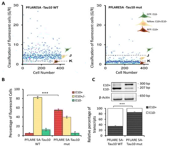 As part of the development of the minigene model for FTDP-17, we introduced the N279K mutation into the PFlare5A-Tau10 WT two-colour (GFP/RFP) fluorescent reporter plasmid developed by Stoilov and colleagues [,], thereby increasing red cells from ~5% to ~58% and decreasing green cells from ~10% to ~5%. This change was associated with a modification in the third subpopulation of cells containing both isoforms, exon 10+ and exon 10- (“Yellow cells”), which decreased from ~82% to ~43%. This decrease reflects a conversion of most cells to favour the production of exon 10+ in the PFlare5A-Tau10 mut reporter plasmid (Figure 3B).