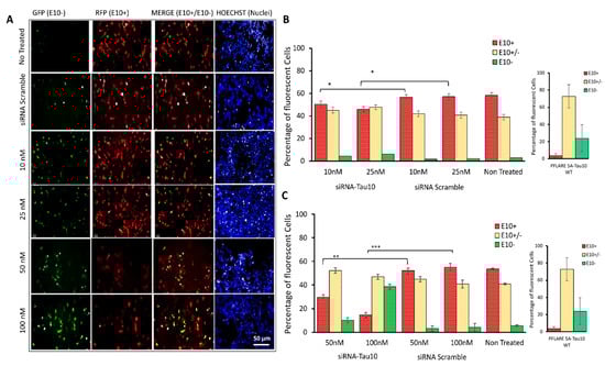 HCS-Splice to evaluate the efficiency of an Exon 10-Target siRNA for splicing modulation. (A) Representative images of SH-SY5Y cells cotransfected with PFlare5A-Tau10 mutant plasmid and siRNA Scramble or Exon 10-Target siRNA at concentrations of 10 nM, 25 nM, 50, and 100 nM (top to bottom). Images were acquired with a high-content screening system (Operetta, PerkinElmer) 48 h after transfection, as described in Figure 2A. The scale bar represents 50 µm. (B,C) The histogram represents the relative percentages of the three sub-populations (E10+, E10+/-, and E10-) of cells containing the mutant reporter (PFlare5A-Tau10 mut) plasmids treated with (B) 10 nM and 25 nM and (C) 50 nM and 100 nM of Exon 10-Target siRNA (siRNA-Tau10). Asterisks (*) indicate significant differences (t-test, * p ≤ 0.05, ** p ≤ 0.01, *** p ≤ 0.001).