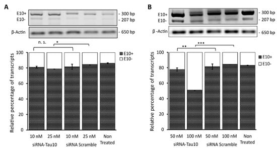 Densitometric analysis showed that the siRNA-Tau10 induced the depletion of transcripts containing exon 10 (E10+) in a dose-dependent manner, confirming the results obtained with the HCS-Splice methods. Indeed, each band relative to the two different isoforms (E10+ and E10-), normalized using the housekeeping gene Beta (β) Actin (650 bp), showed that upon treatment with 10 nM there was no significant difference between the level of E10+ compared to the siRNA scramble control (p = n.s.), whereas, at a concentration of 25 nM, we observed a slight decrease in E10+, by ~5% (p < 0.05) (Figure 5A). Interestingly, we were able to gradually decrease the level of E10+ by almost ~10% (p ≤ 0.01) after treatment with 50 nM and by ~35% (p ≤ 0.001) by using the siRNA-Tau10 at a concentration of 100 nM (Figure 5B). The control siRNA scramble at different concentrations did not affect the E10+ isoform, as expected (Figure 5). The untreated mutant plasmid was compared with the different siRNA treatment conditions. These data further support and confirm the effects observed through the HCS-Splice image-based analysis.