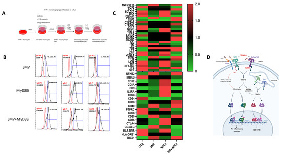 MyD88−dependent modulation of M2 polarization by simvastatin. (A) A schematic representation of simvastatin, MyD88 inhibitor treatment, and THP-1-macrophages (M0–M1–M2). (B) Cell surface antigen analysis of M2 macrophage markers CD68, CD163, and CD206 was conducted using flow cytometry. Expression levels were normalized using IgG isotype control, and values were expressed in percentage of positive cells (mean ± SD) from three independent preparations. (C) RT-PCR analysis and heat maps summarizing TLR and NFkB signaling from M0 (CCL2), M1 (LPS, IFNγ, TNFα), and M2 (IL4, IL10, TGFβ) macrophages. (n = 3) preparations per treatment group, and data found to be significantly different were plotted as heat maps. (D) Graphical summary of statin-mediated suppression of TLR and NFkB signaling.