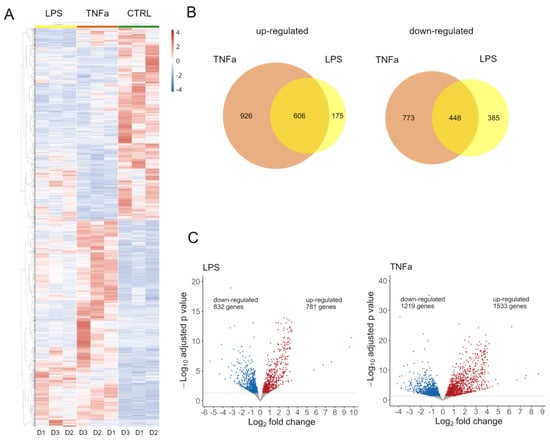 (A) The result of the RNA sequencing evaluation can be seen on the heat map. Gene expression changes of three human AD-MSC donors can be observed under treated conditions with control (green), LPS (yellow), and TNFα (red) treated conditions. The three conditions can be well separated, but there are some similarities between them. (B) Venn diagram (left) represents the number of genes with increased expression by TNFα (brown) and LPS (yellow), and the fitted cross-section shows genes that were affected by the two treatments. The Venn diagram (right) represent the number of genes with reduced expression due to TNFα (brown) and LPS (yellow) treatment; the adjusted cross-section shows genes affected by the two treatments. (C) Volcano plots show the genes with significantly increased or decreased gene expression that changed the most as a result of treatments. Genes with the highest reduced expression (blue) and those with increased expression (red) are shown.