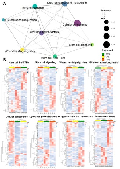 We selected genes from the gene sets that were differentially expressed in at least one of the treatments; wherever we found identical genes, we made a connecting line between the sets represented by dots (Figure 2A). The widths of the lines represent the number of identical genes, while the size of each dot represents the fraction of DEGs in the entire gene set. In general, we can see that each set of genes is connected to at least five other sets and “wound healing migration”, “cellular senescence”, “cytokines growth factors”, “immune response”, and “stem cell EMT TEM” are connected to every other set, displaying dense interconnectedness.