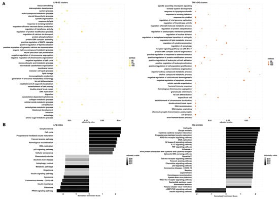 (A) Parent terms of the results of the gene set enrichment analysis based on GO terms in the LPS and TNFα treatments. The x-axis represents adjusted p values; the size of the dots shows the size of each GO term’s gene set. (B) Results of the gene set enrichment analysis based on KEGG in LPS and TNFα treatments. The pathways are ordered according to their normalized enrichment score, and the color intensity of the columns depends on the adjusted p-value.