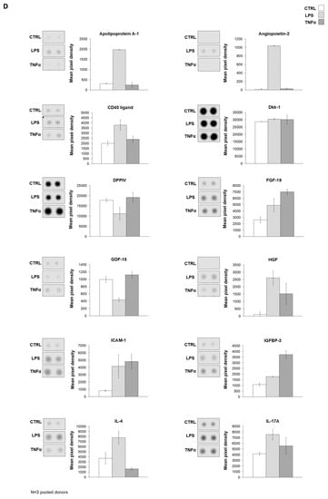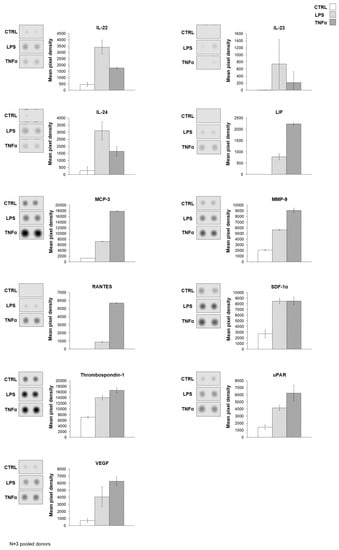 Three AD-MSC donors were treated with LPS and TNFα, as described above. Supernatants were collected and stored at −80 °C until use. After thawing the samples, the supernatants were pooled by type of treatment and applied to the Human XL cytokine array Kit Proteome Profiler (R&D Systems, Biotechne, McKinley Place NE, Minneapolis, MN, USA) to determine secreted factors. The array was carried out according to the manufacturer. The images were quantified using Fiji (Image J 1.53S) with an embedded Protein Array Analyzer (Version:1.1.c) macro.