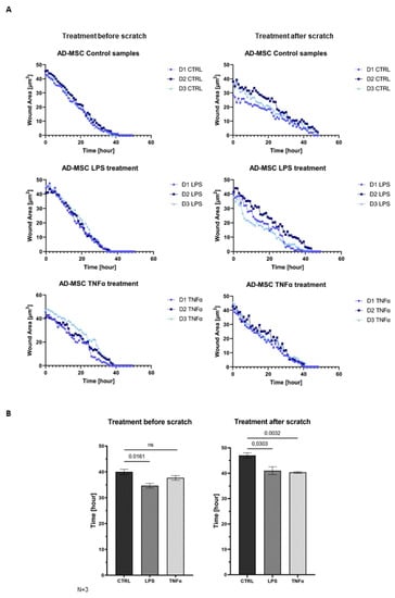 AD-MSCs are involved in all three parts of wound healing: the inflammation phase, proliferation phase, and remodeling phase. The wound healing assay demonstrated that MSCs promote faster wound closure after LPS and TNFα treatment compared to the control (Figure 5A). In that case, when treatment took place before woundmaking, the wounds of the control sample were closed around 40 h and the treated samples presented wound healing around 34.67 h after LPS and 37.67 h upon TNFα treatment. In the condition where scratching occurred before inflammation was triggered, the wounds of control samples closed around 47 h, and the treated samples closed faster, and they were remodeled around 41 h after LPS and 40.33 h after TNFα treatment. Graphs show significant changes in wound-closure speed between controls and in the presence of inflammation. It appeared that the closing speed was significantly higher in the case where inflammation induced after scratch formation was formed. AD-MSCs presented accelerated wound healing under inflammation conditions, and AD-MSCs were triggered by inflammatory factors to facilitate wound healing (Figure 5B).