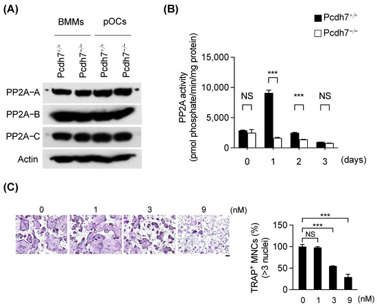 Figure 1. Pcdh7 deficiency results in impaired PP2A activity in osteoclasts. (A) Expression levels of PP2A subunits in Pcdh7+/+ and Pcdh7−/− BMMs and preosteoclasts. Cell lysates were analyzed by western blotting using indicated antibodies. (B) PP2A activity in Pcdh7+/+ and Pcdh7−/− cells. Horizontal axis indicates days after RANKL stimulation. Day 0 indicates BMMs. PP2A enzyme activity was determined in whole-cell lysates. (C) Effect of protein phosphatase inhibitor okadaic acid on osteoclast differentiation. Pcdh7+/+ BMMs were treated with M−CSF + RANKL for three days in the presence of the indicated amount of okadaic acid. The percentage of TRAP+ multinucleated cells (three nuclei or more per cell) is shown (right). The scale bar represents 100 μm. Data are shown as the mean ± S.D. *** p < 0.001. NS—not significant. Data are representative of three experiments.