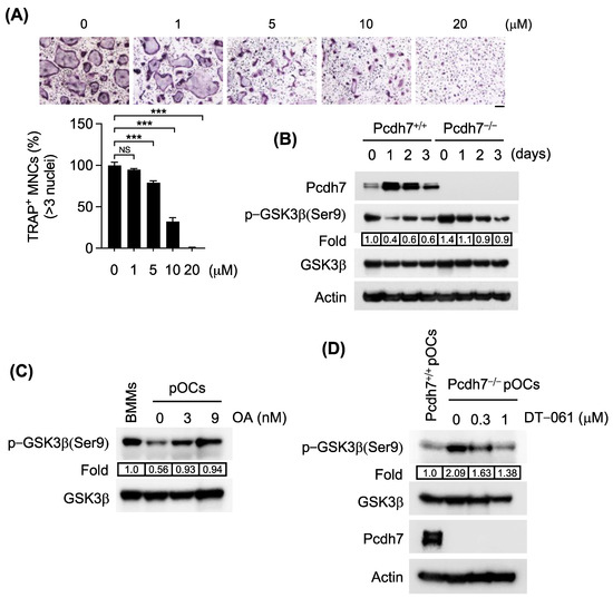 Figure 2. Pcdh7 deficiency results in impaired PP2A-mediated GSK3β activation in osteoclasts. (A) Effect of the GSK3β inhibitor AR−A014418 on osteoclast differentiation. Pcdh7+/+ BMMs were treated with M−CSF + RANKL for three days in the presence of the indicated amount of AR−A014418. The percentage of TRAP+ multinucleated cells (three nuclei or more per cell) is shown (bottom). The scale bar represents 100 μm. Data are shown as the mean ± S.D. *** p < 0.001. NS—not significant. (B) Phosphorylation of GSK3β in the presence or absence of Pcdh7. BMMs from Pcdh7+/+ and Pcdh7−/− mice were cultured with M−CSF + RANKL for up to three days, and western blotting was performed with the indicated antibodies. (C) Pcdh7+/+ preosteoclasts were treated with the indicated amount of okadaic acid, and phosphorylation of GSK3β was detected by western blotting. BMMs were used as a control. (D) Pcdh7−/− preosteoclasts were treated with the indicated amount of PP2A activator DT−061, and phosphorylation of GSK3β was detected by western blotting. Pcdh7+/+ preosteoclasts were used as a control. Data are representative of three experiments.