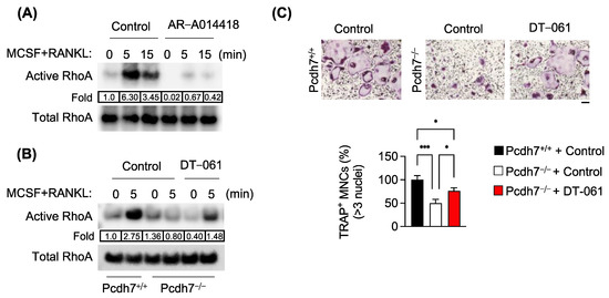 Figure 3. Pcdh7-dependent RhoA activation requires PP2A and GSK3β. (A,B) Effect of the GSK3β inhibitor AR−A014418 and the PP2A activator DT−061 on activation of RhoA. Pcdh7+/+ preosteoclasts were stimulated with M−CSF + RANKL for the indicated times in the presence or absence of (A) AR−A014418 (10 μM) and (B) DT−061 (10 μM). Whole-cell lysates were used to detect the activated form of RhoA. (C) Effect of DT−061 on osteoclast differentiation. Pcdh7+/+ and Pcdh7−/− BMMs were treated with M−CSF + RANKL for three days in the presence of DT−061 (10 μM). The percentage of TRAP+ multinucleated cells (three nuclei or more per cell) is shown (bottom). The scale bar represents 100 μm. Data are shown as the mean ± S.D. * p < 0.05, *** p < 0.001. Data are representative of three experiments.