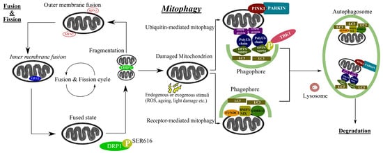 Autophagy refers to a procedure of degradation and recycling of intracellular materials and inoperative organelles, which preserves cellular homeostasis []. It is subclassified into macroautophagy, microautophagy and chaperone-mediated autophagy. These three types of autophagy are completed through different mechanisms, but the final goal is the same: transportation of intracellular materials to lysosomes, where they can be degraded by hydrolytic enzymes []. In order to remain intact, mitochondria undergo several processes such as fusion (junction of two mitochondria into one), fission (separation of one mitochondrion into two), biogenesis (creation of new mitochondria) and mitophagy (degradation of mitochondria by autophagy) []. Mitophagy is a selective subtype of macroautophagy and a mitochondrial quality control process in which dysfunctional mitochondria are degraded in lysosomes [] (Figure 1). Based on the targeting signals in impaired mitochondria that commence the process, it is divided into ubiquitin-dependent mitophagy, ubiquitin-independent or receptor-based mitophagy, lipid-based mitophagy and micromitophagy, with the first two categories being the most common []. An accumulation of mitochondrial DNA (mtDNA) mutations and diminished mitochondrial activity are thought to contribute to the normal aging process [] and are associated with various systemic diseases, including heart failure, diabetes and cancer []. Mitophagy, as a quality control mechanism, is considered critical to the prevention of human disease by retaining normal cellular function, while aberrant mitophagy is implicated in the pathogenesis of multiple metabolic, cardiovascular, skeletal muscle and neurodegenerative diseases, including Alzheimer’s disease, amyotrophic lateral sclerosis, and Duchenne muscle dystrophy []. Several studies have demonstrated the importance of mitophagy in glaucomatous degeneration [,,], as well as in other ocular diseases []. In the next section, we explore in more detail the different mitophagy-related genes (Table 1) and the growing scientific evidence that links mitophagy to glaucoma.