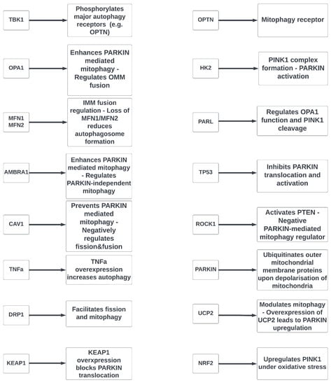 Synopsis of the main effects that proteins derived from mitophagy-related genes have on mitophagy and mitophagy pathways.