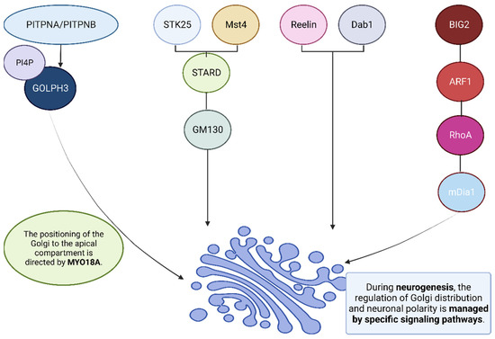 Signaling pathways play an essential role in organizing the Golgi apparatus and maintaining neuronal polarity during neurogenesis. First, lipid transfer proteins (PITPNA/PITPNB) augment GOLPH3 recruitment to the Golgi apparatus via PI4P signaling; which promotes its positioning towards MYO18A’s target compartment. Secondly, STK25 and Mst4, two downstream effectors of LKB1, possess the capacity to co-immunoprecipitate with STRAD and bind to Golgi matrix protein GM130, acting as key organizers within its organelles. Reelin and Dab1 also regulate the expansion of Golgi bodies into pyramidal neurons’ apical processes. Finally, the BIG2-ARF1-RhoA-mDia1 signaling pathway plays an integral role in controlling dendritic Golgi deployment and growth in newly created hippocampal neurons in adults.