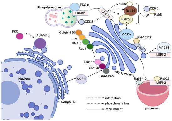 Leucine-rich repeat kinase 2 (LRRK2), Rabs, VPS52, and Cyclin-dependent Kinase 5 (CDK5) [109] have all been linked with Parkinson’s disease (as it can be seen in Figure 3). Of these proteins, LRRK2 stands out as being particularly prevalent, being one of the more frequently mutated genes associated with the condition-LRRK2 contains both GTPase domains; mutations are present both with autosomal dominant Parkinsonism as well as being linked with its development sporadically; its mutation rate accounts for around one percent and five percent in relation to familial Parkinsonism, respectively, making LRRK2 one of its more prominent genetic contributors to its association with Parkinsonism. LRRK2 plays an essential role in the GA [110,111,112,113]. LRRK2 mutants disrupt its integrity and vesicle trafficking. Furthermore, inactivation of LRRK2 leads to Golgi fragmentation and disrupted vesicle trafficking in hu man kidney proximal tubular epithelial cells via endocytosis and autophagy; additionally affecting endosomal system components including endocytosis and autophagy, with its dysfunction altering endosomal system components and organelles like endosomal and lysosomal function as well as synaptic vesicle trafficking, eventually altering neuronal function and synaptic plasticity (Figure 3).