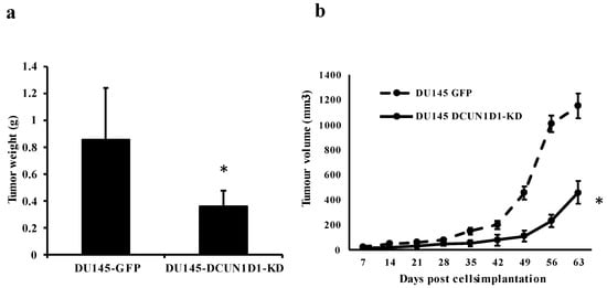 After establishing DCUN1D1 as a regulator of PCa carcinogenesis, we evaluated its role in tumour formation. To determine whether inhibition of DCUN1D1 affects tumour formation in vivo, we used a xenograft mouse model MF1 where mice were subcutaneously implanted in the right flank with DU145-DCUN1D1-KD or DU145-GFP cells. Tumour development was followed, and 2 months later mice were sacrificed, examined for tumour formation and the tumours were weighted. As shown in Figure 3a, blockage of DCUN1D1 significantly reduced tumour growth with a 58% reduction in tumour weight. Likewise, tumour development was significantly delayed in DCUN1D1-KD when compared to GFP-KD control cells (Figure 3b). These data reinforce the notion that DCUN1D1 plays a key role in PCa development.