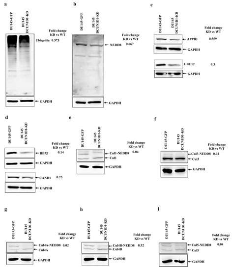 Blockage of DCUN1D1 decreases global neddylation, ubiquitination and expression of neddylation components and shows preferential neddylation activity of cullin proteins in PCa. Western blot analysis of DU145 and DU145 DCUN1D1-KD cells. Protein extracts were obtained from the cells and subjected to Western blot analysis using (a) anti-ubiquitin, (b) anti-Nedd8. Blockage of DCUN1D1 decreased the expression of the neddylation pathway components including (c) the E1 NAE heterodimer APPB1 (top panel) and the neddylation-conjugating enzyme, UBC12 (bottom panel) and (d) the cullin-associated proteins RBX1 (top panel) and CAND1 (bottom panel). Inhibition of DCUN1D1 showed preferential NEDD8 modification of the cullin family of proteins. Immunoblot analysis of DU145 and DU145 DCUN1D1 knockdown cell protein extracts using (e) anti-cullin 1, (f) anti-cullin 3, (g) anti-cullin 4A, (h) anti-cullin 4B and (i) anti-cullin 5. The GAPDH loading control was probed using the anti-GAPDH antibody. Experiments were independently repeated three times and a representative image of an independent experiment is represented.