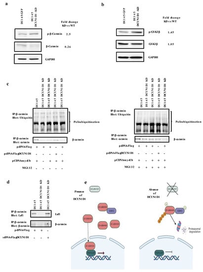 Inhibition of DCUN1D1 deactivated the WNT signalling pathway. Protein extracts containing DU145-GFP and DU145 DCUN1D1-KD cell lines were analysed using Western blot analysis. Inhibition of DCUN1D1 (a) increased phosphorylation of β-catenin and reduced expression of total β-catenin and (b) increased the phosphorylated levels of Gsk-3β. The GAPDH was used as loading control. (c) Blockage of DCUN1D1 inhibits ubiquitination of β-catenin. DU145 DCUN1D1-KD and DU145-GFP cells were transfected with pCDNA Myc–Ub and pCDNA Flag–DCUN1D1 expression vector or parental vector and treated with proteasome inhibitor (MG132) for 4 h. Proteins were immunoprecipitated using anti-β-catenin antibody. Ubiquitinated β-catenin was detected by using anti-ubiquitin antibody. Re-expression of DCUN1D1 protein restores β-catenin expression. (d) Blockage of DCUN1D1 expression inhibited β-catenin/ Lef1 interaction. Proteins from DU145 and DU145 DCUN1D1-KD transfected with pCDNA Flag–DCUN1D1 cells were immunoprecipitated using anti-β-catenin antibody. The interaction between the proteins was detected by anti- Lef1 antibodies (e) Schematic representation of the DCUN1D1 pathway in PCa. Experiments were independently repeated three times and a representative image of an independent experiment is represented.