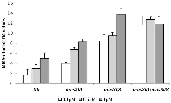 MMS-induced DNA damage in vivo. Arithmetic means and standard errors of MMS-induced TM values, from at least three independent experiments, for all the analyzed concentrations in each studied strain.