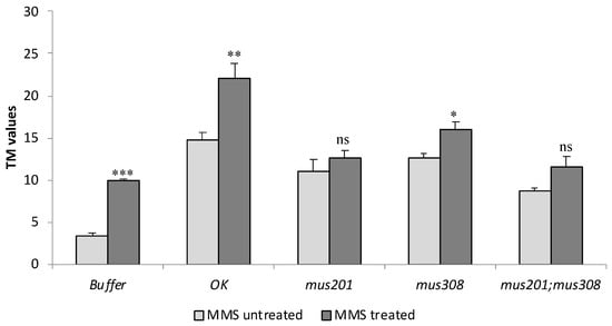 Ex vivo DNA damage response analysis. Mean TM values, adjusted for protein content, and their SE (n = 3), induced by the ex vivo incubation with cell-free extracts from all the analysed strains and with their solvent (Buffer), on nucleoids from OK larvae treated in vivo with 1 mM MMS (MMS treated) or with MilliQ water (MMS untreated). Asterisks indicate comparisons between MMS treated and untreated nucleoids for each extract: * p < 0.05; ** p < 0.01; *** p < 0.001; ns, non-significant.