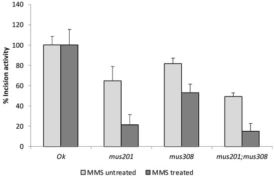 As indicated by Gaivão et al. [], repair mutant strains should be compared to the repair-efficient one over the same level of DNA damage, and, therefore, relative activities were estimated separately for MMS-untreated and MMS-treated cells. For spontaneous DNA damage (MMS-untreated cells), the relative incision activities of each mutant strain were 64.9%, 81.7%, and 49.2% for mus201, mus308, and mus201;mus308, respectively.